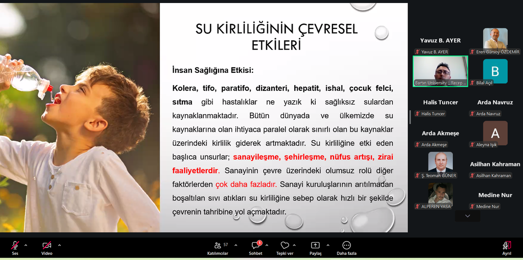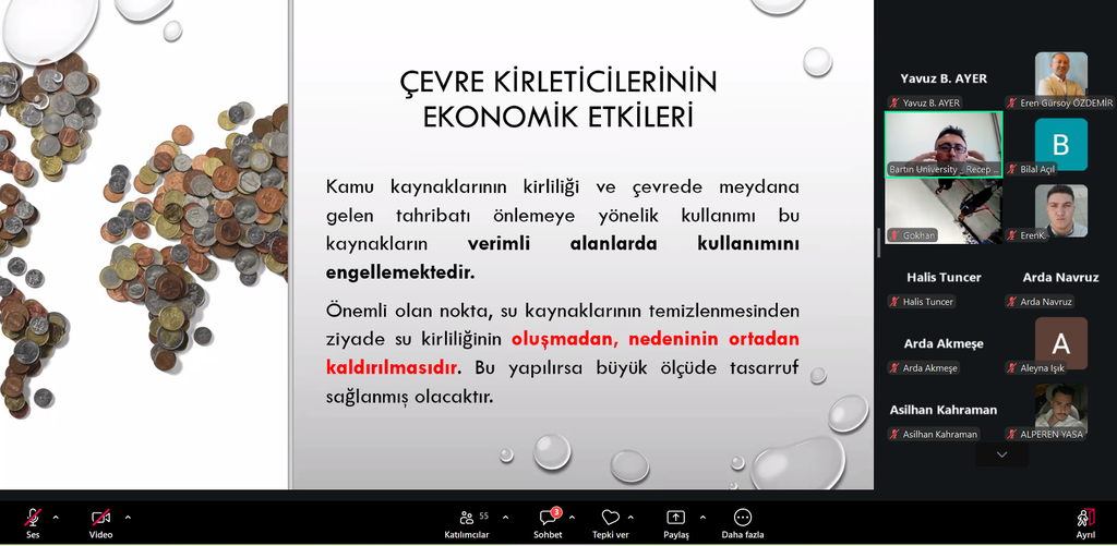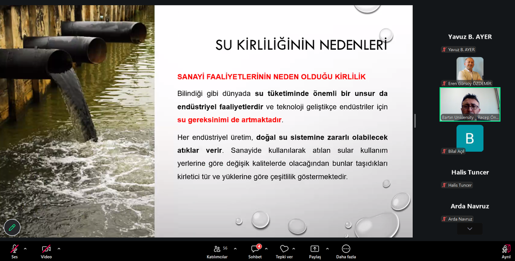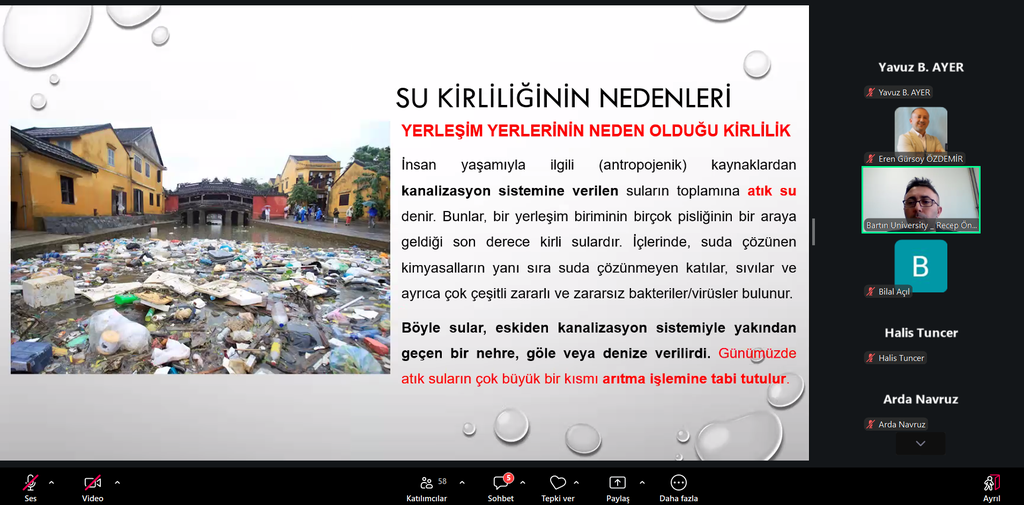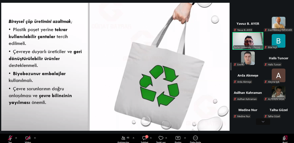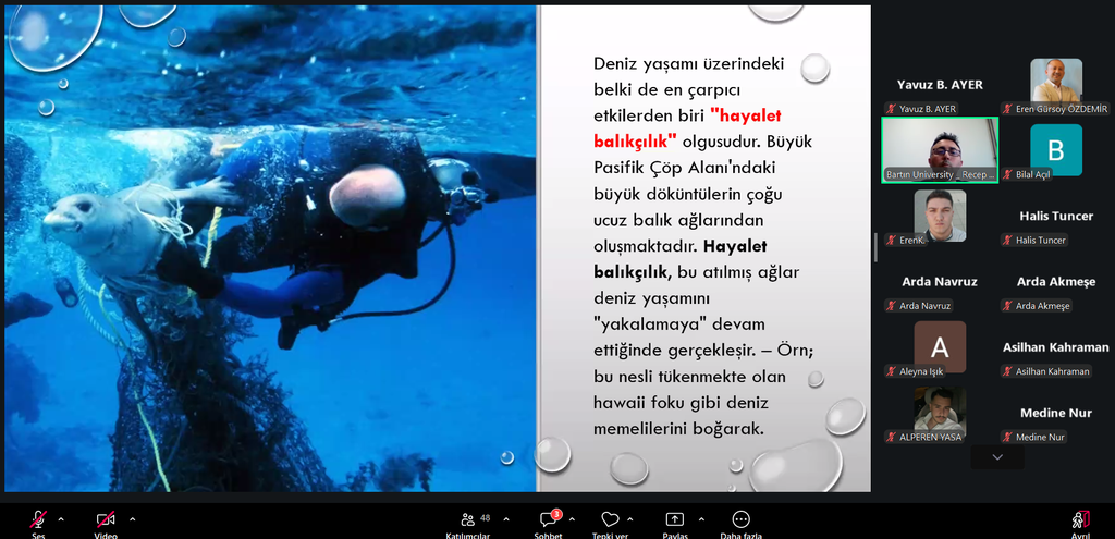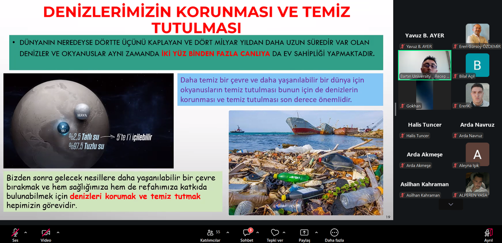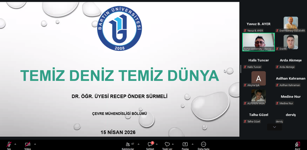 Bu kapsamda, deniz çöpleriyle etkin mücadele edilmesi ve doğal kaynakların sürdürülebilir kullanımı konusunda farkındalık oluşturulması amacıyla, Mühendislik, Mimarlık ve Tasarım Fakültesi Çevre Mühendisliği Bölümünden Dr. Öğr. Üyesi Recep Önder Sürmeli tarafından 15 Nisan 2026 tarihinde saat 14.00’te çevrimiçi bir eğitim düzenlendi.