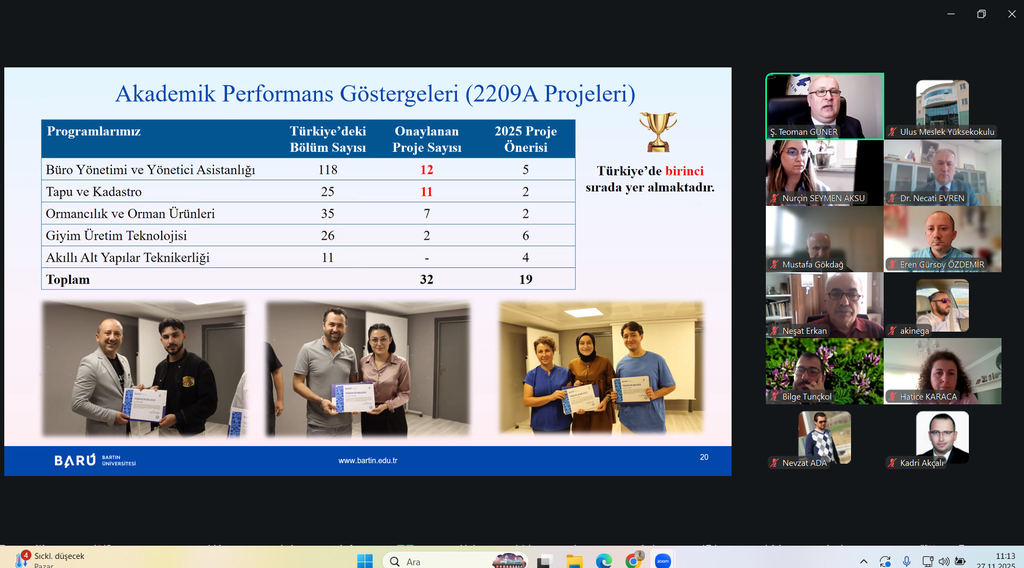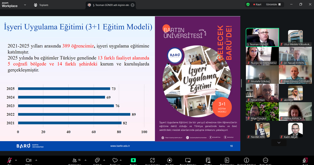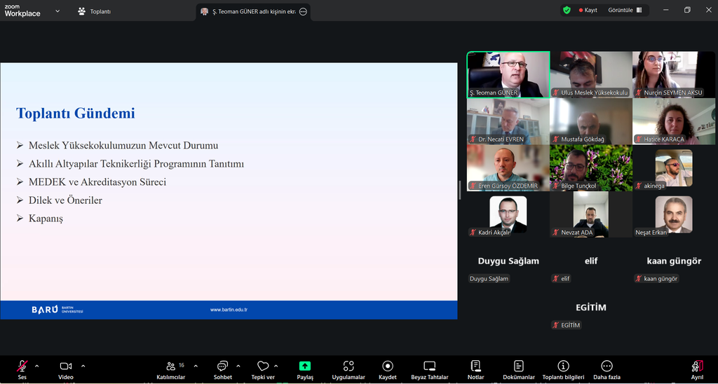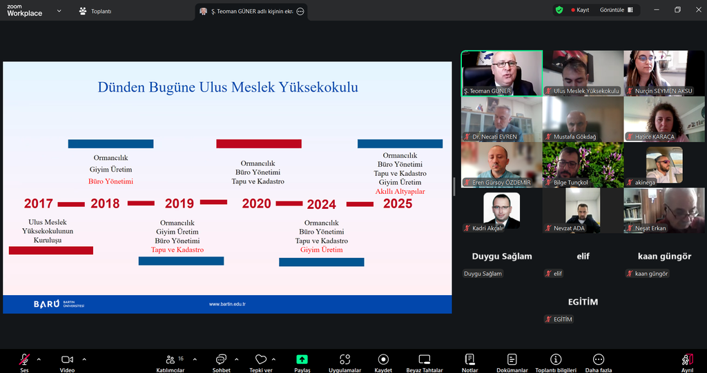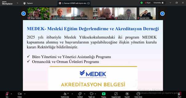 Toplantı, Meslek Yüksekokulu Müdürü Doç. Dr. Şükrü Teoman Güner’in açılış konuşması ve Yüksekokulun genel tanıtımıyla başladı. Ardından gündem kapsamında, Meslek Yüksekokulu bünyesinde yeni açılan İnşaat Bölümü Akıllı Altyapılar Teknikerliği Programı hakkında ayrıntılı bilgilendirme yapıldı. Ayrıca Ormancılık ve Orman Ürünleri ile Büro Yönetimi ve Yönetici Asistanlığı Programlarının akreditasyon sürecine ilişkin gelişmeler kurulla paylaşıldı.