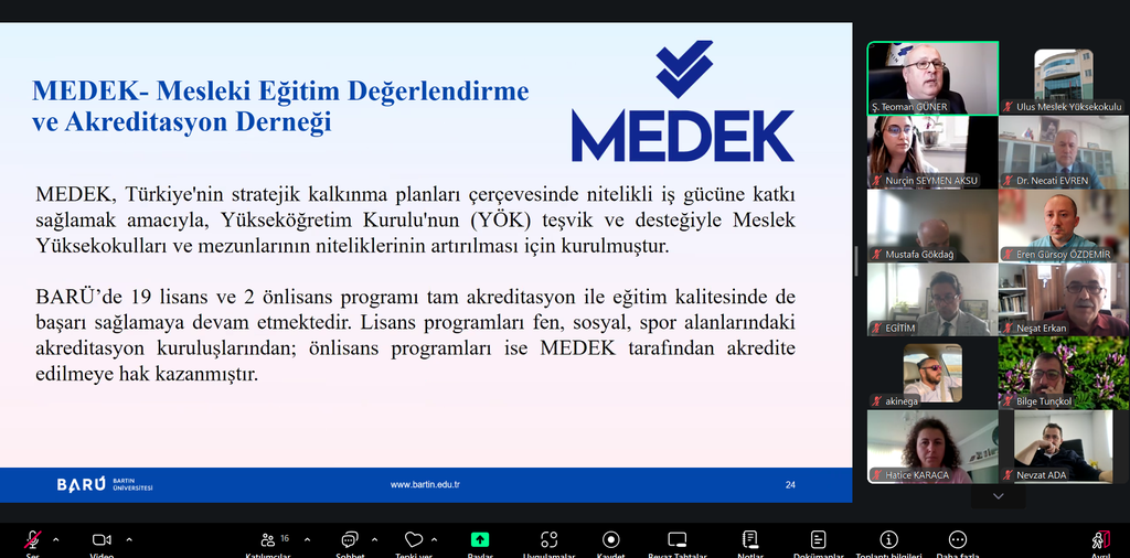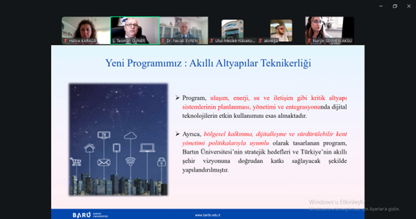 Değerlendirme bölümünde söz alan Bursa Teknik Üniversitesi’nden Prof. Dr. Neşat Erkan, Meslek Yüksekokulu’nun çalışmalarından duyduğu memnuniyeti dile getirerek özellikle Mesleki Eğitim Değerlendirme ve Akreditasyon Derneği (MEDEK)  süreçlerine ilişkin görüşlerini aktardı. Bartın Üniversitesi Orman Fakültesi Öğretim Üyesi Prof. Dr. Erol Kırdar ise yüksekokulun başarı grafiğinden duyduğu memnuniyeti ifade edip MEDEK çalışmaları konusunda öneri ve deneyimlerini paylaştı. BOTAŞ’ta Daire Başkanı Harita Mühendisi Dr. Necati Evren, Akıllı Altyapılar Teknikerliği Programı’nın disiplinler arası önemine dikkat çekerek programın kuruluş aşamasındaki ders planlarına katkı sunmaktan duyduğu memnuniyeti belirtti. Evren ayrıca kurumlarla yapılan iş birliklerinin değerine vurgu yaparak özellikle 3+1 eğitim modelinin uygulama döneminin kurumlarda gerçekleşmesinin önemini ve öğrencilerle sektör uzmanlarını buluşturan söyleşi programlarının katkısını ifade etti.