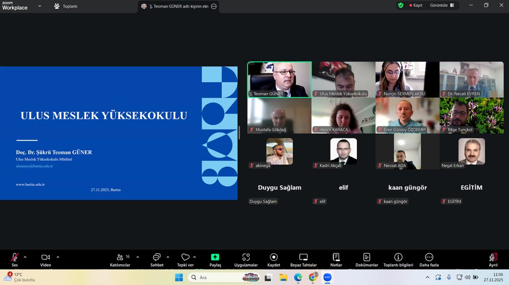 Ulus Meslek Yüksekokulu’nun eğitim-öğretim, araştırma ve topluma hizmet süreçlerinin etkinliğini artırmak, kamu ve özel sektör kuruluşlarıyla iş birliğini güçlendirmek ve sürdürülebilirliği sağlamak amacıyla oluşturulan Danışma Kurulu, 27 Kasım 2025 Perşembe günü saat 11.00’de çevrimiçi olarak toplandı.