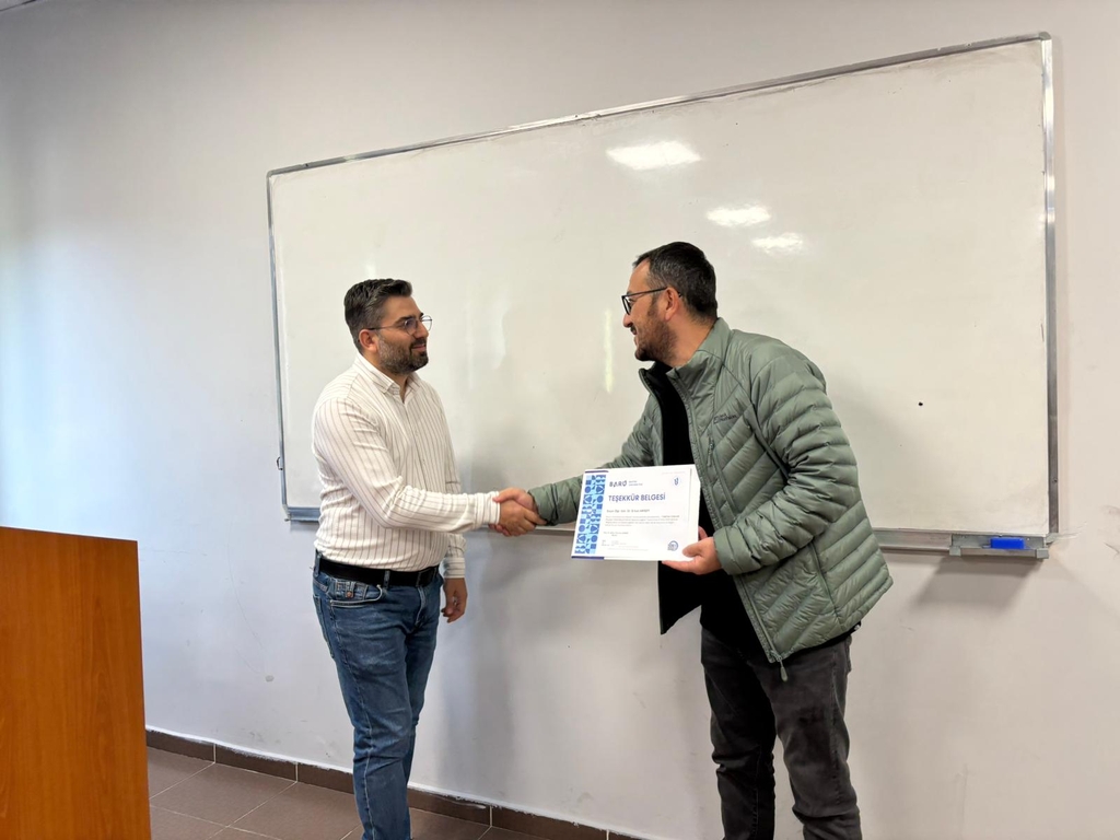 Etkinliğin sonunda, Ulus Meslek Yüksekokulu Müdür Yardımcısı Doç. Dr. Bilge Tunçkol tarafından katkılarından dolayı Öğr. Gör. Dr. Erkan Aksoy’a teşekkür belgesi takdim edildi.